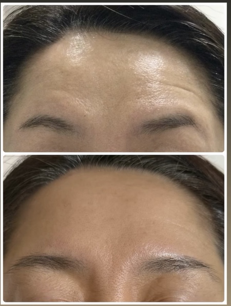 施術前は、額の緊張や眉まわりの盛り上がりで、眉が少し下がり、額のシワも目立ちやすい状態でした。